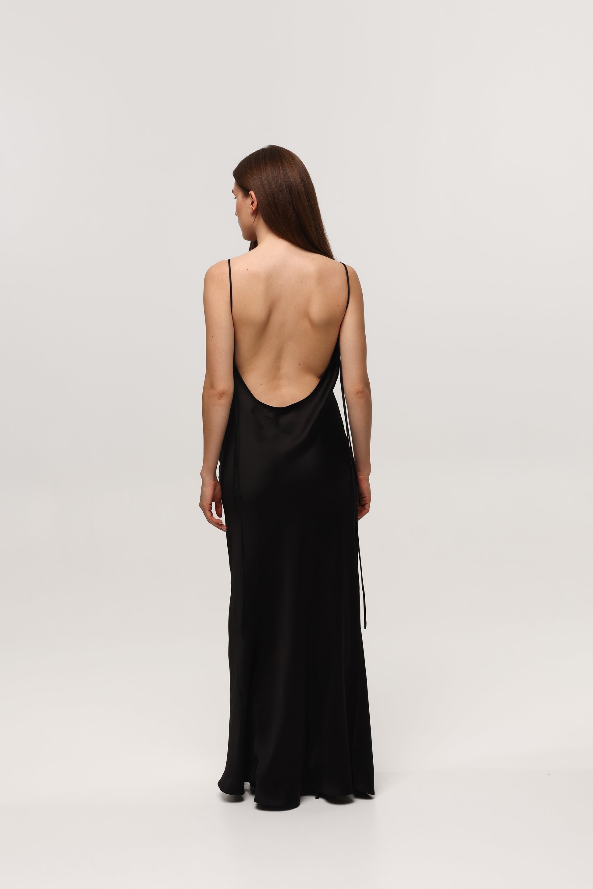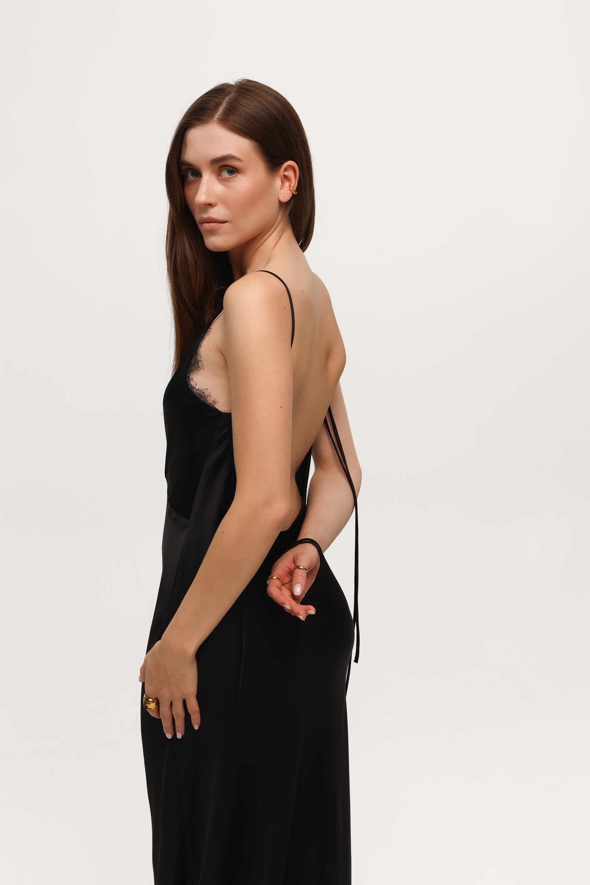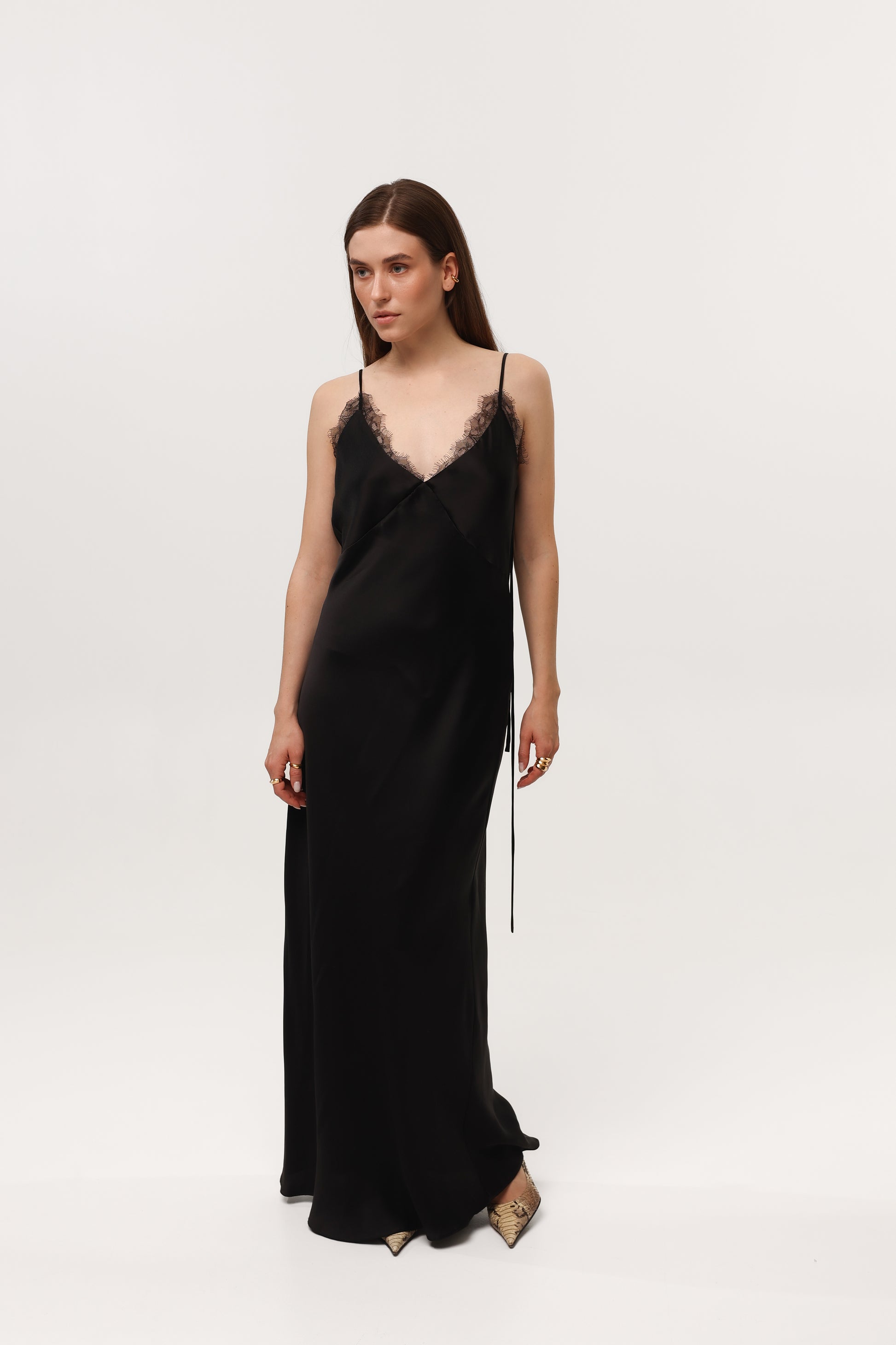 Атласна сукня – наш символ глибини та жіночності. Глибокий чорний колір, французьке мереживо та довжина максі – кожен елемент доповнює та довершує тендітність силуету.