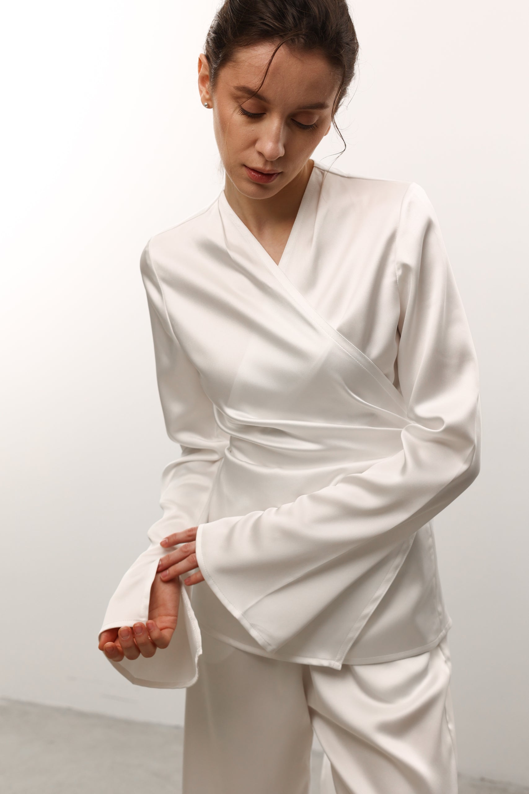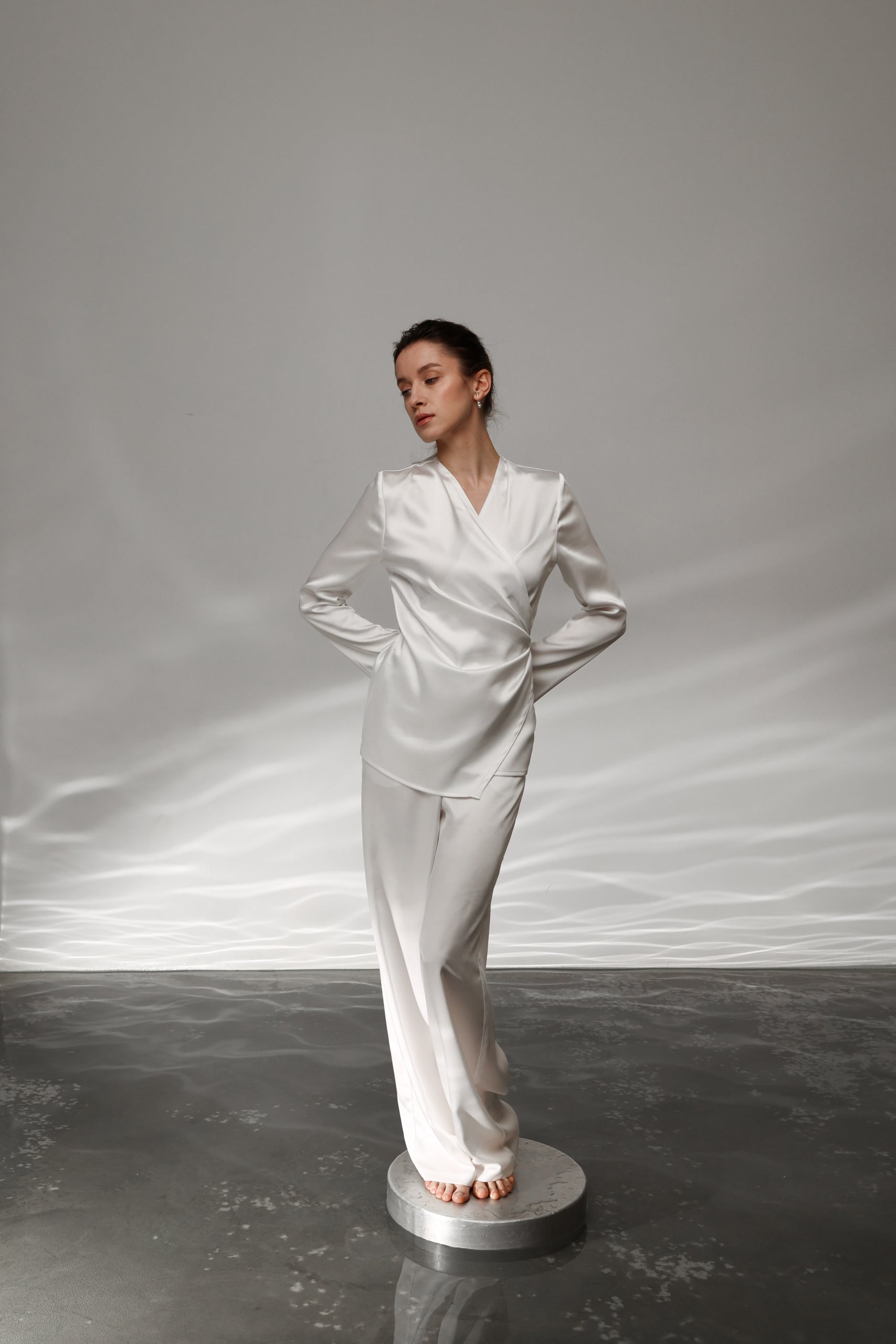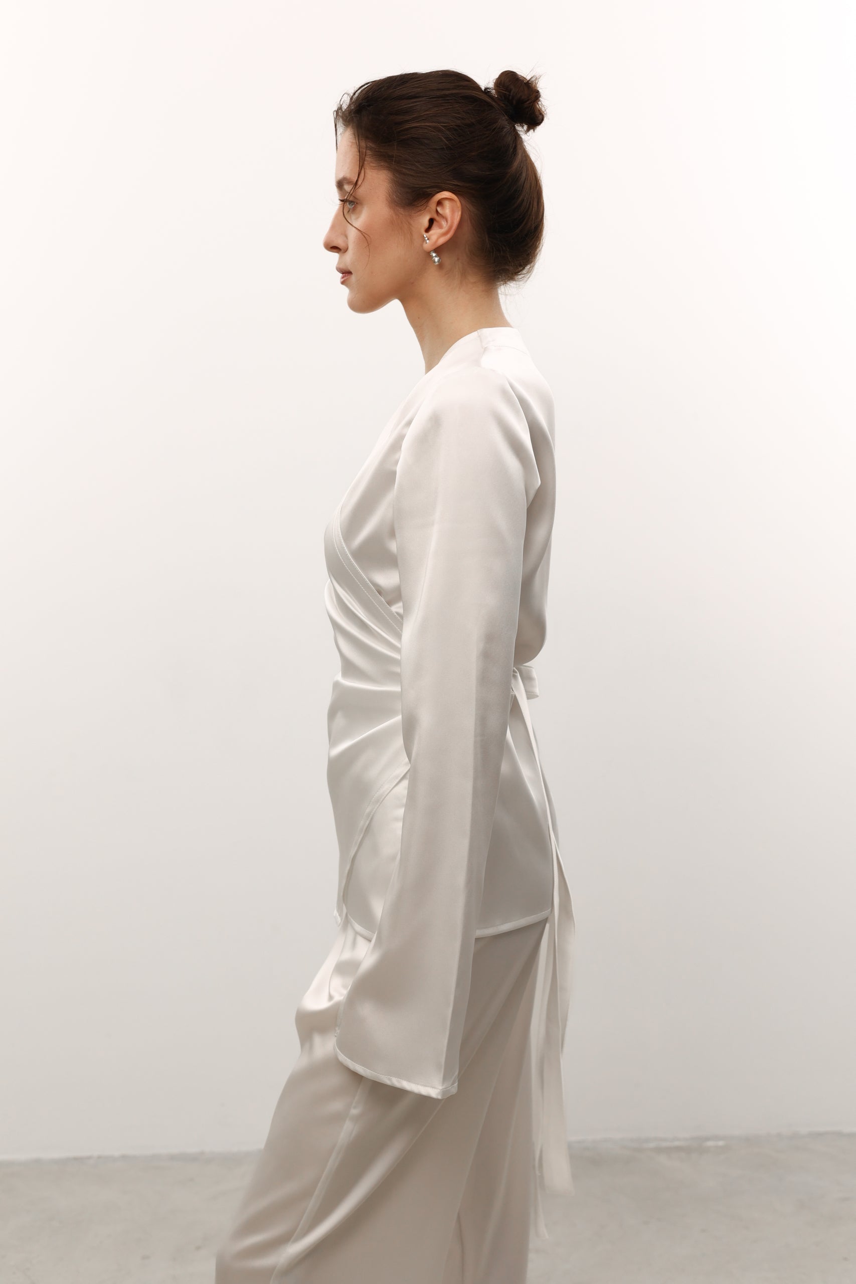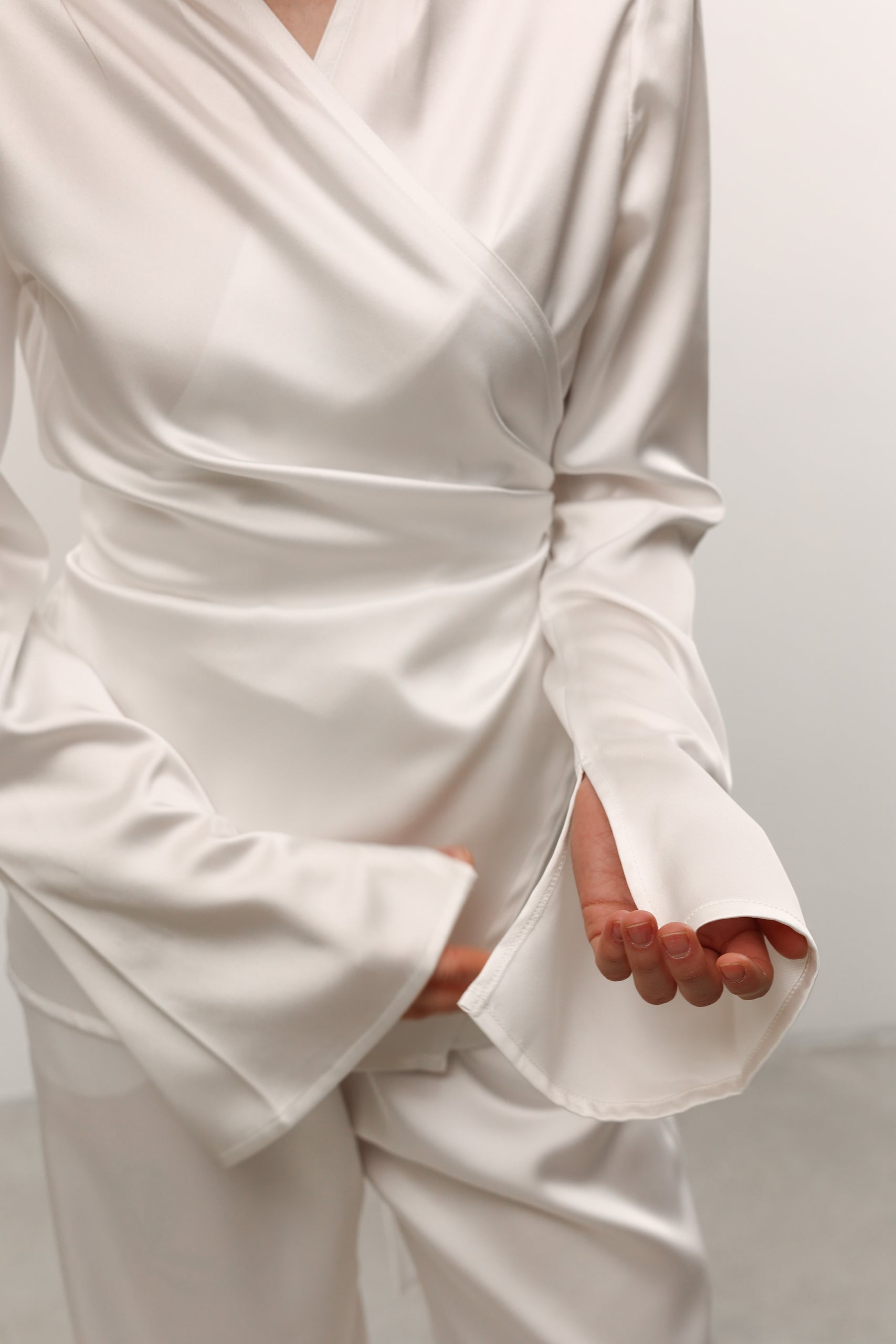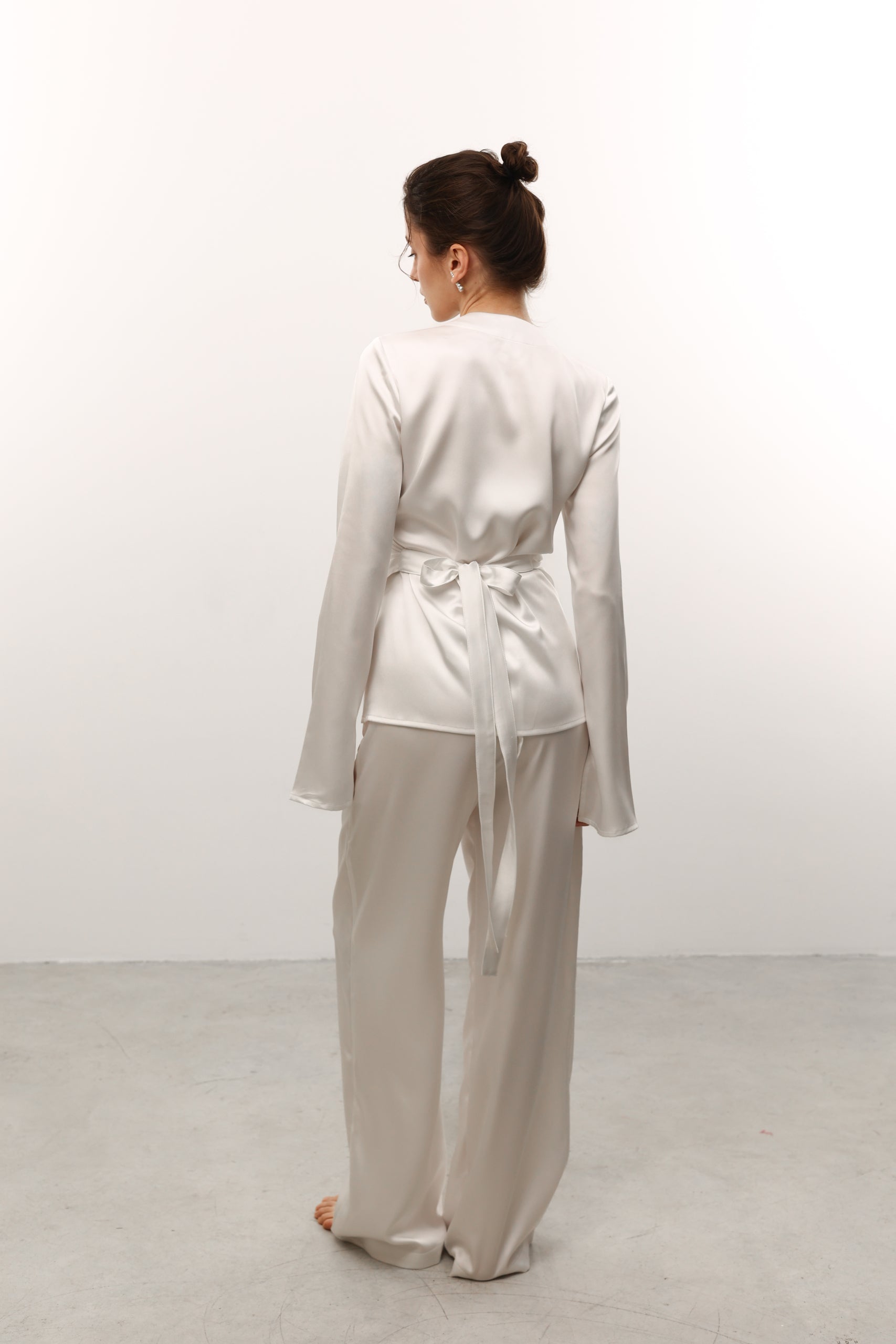 В комплекті з кімоно доступні до замовлення атласні штани кльош.