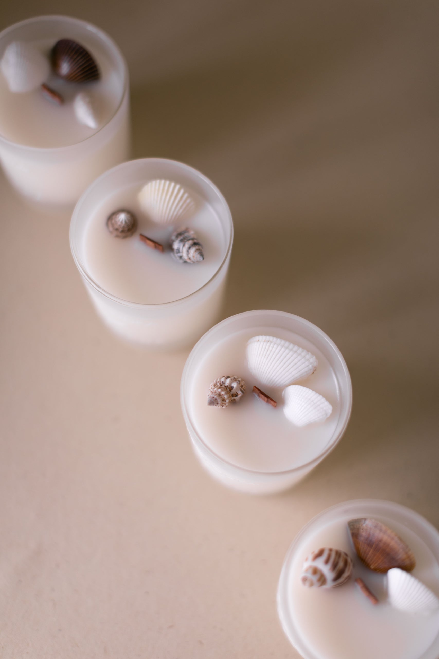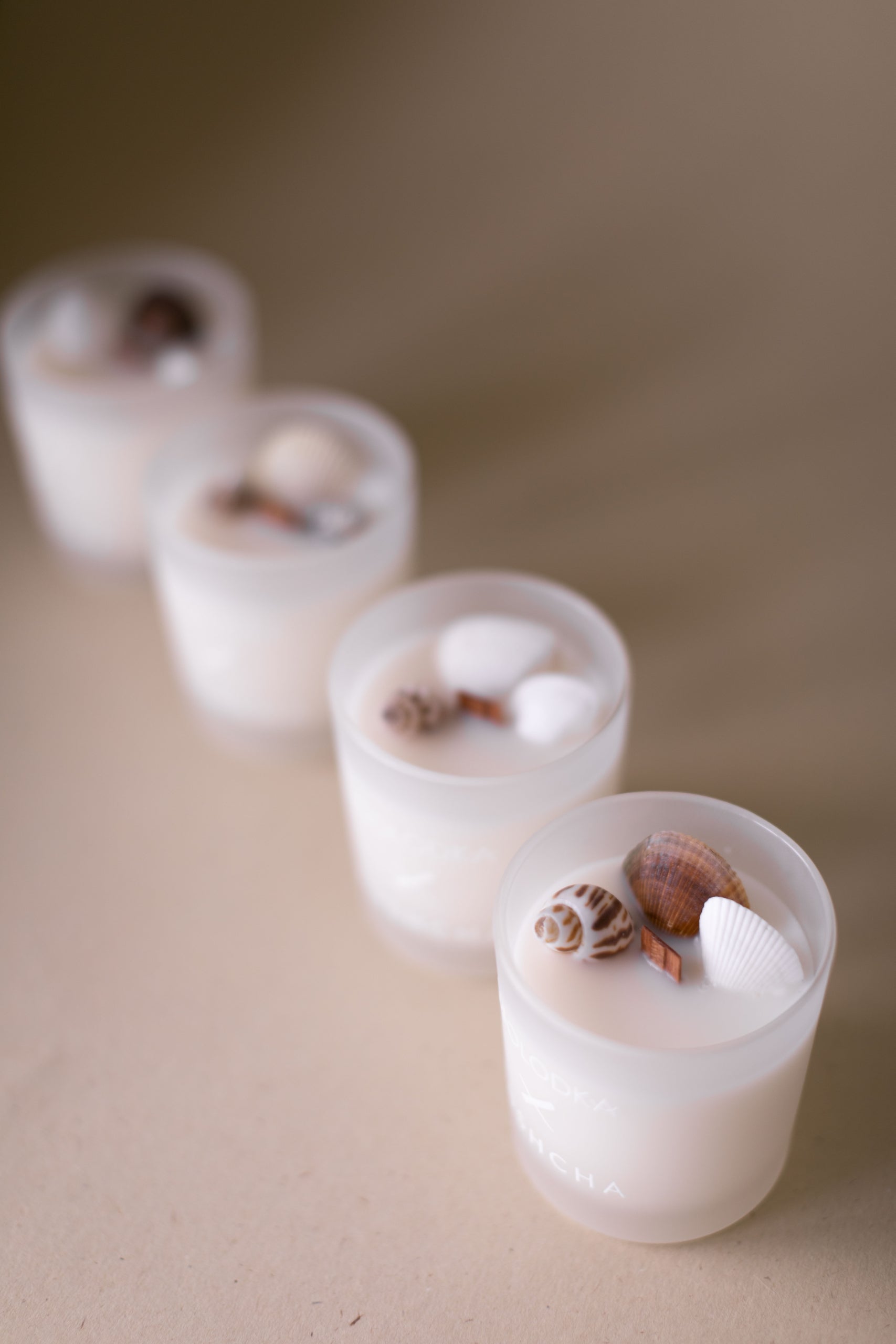 Свічка з натурального соєвого воску не лише пахне морем, а й містить натуральні мушлі згори.