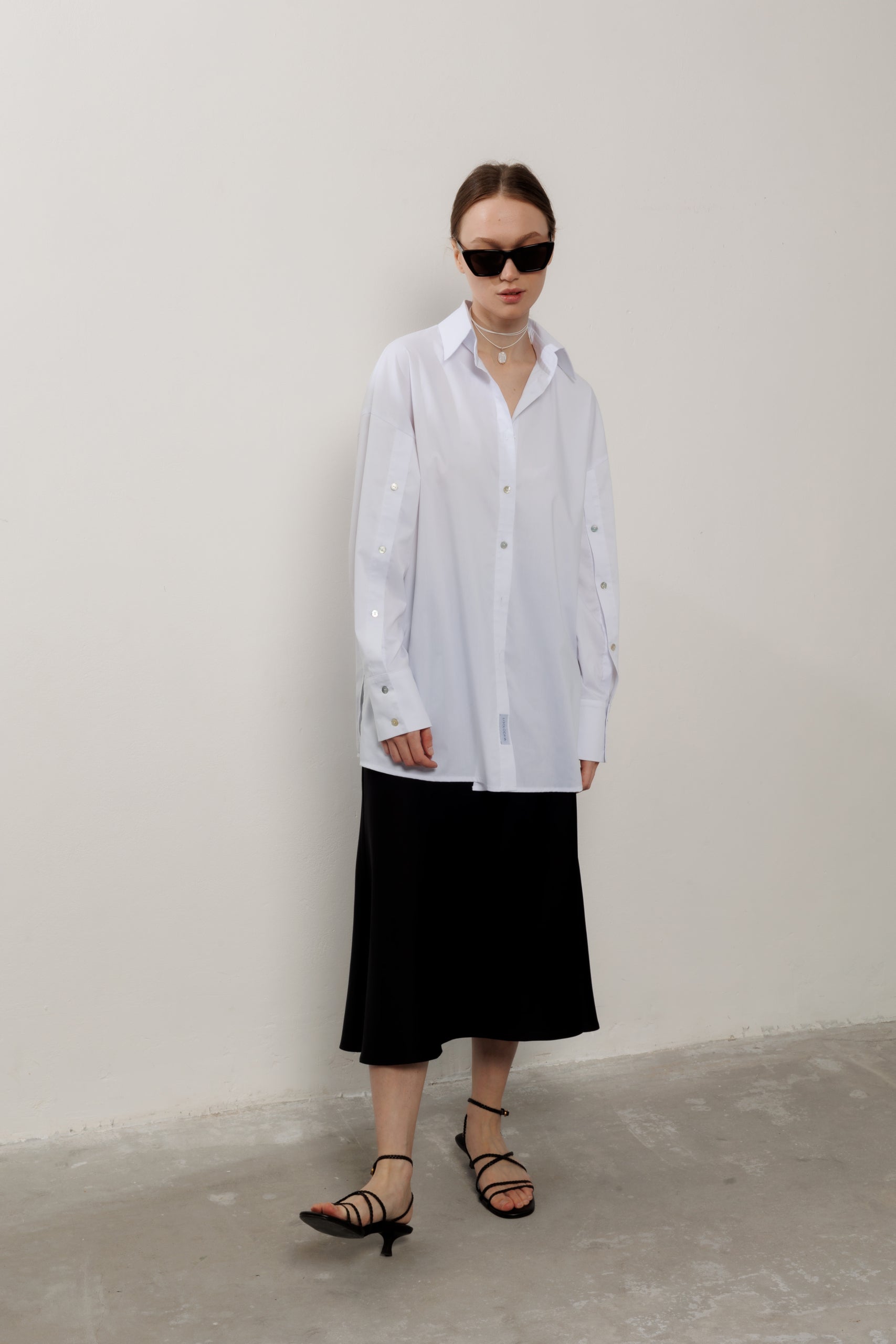 Деталі: функціональні розрізи на рукавах, оздоблені ґудзиками з натурального перламутру