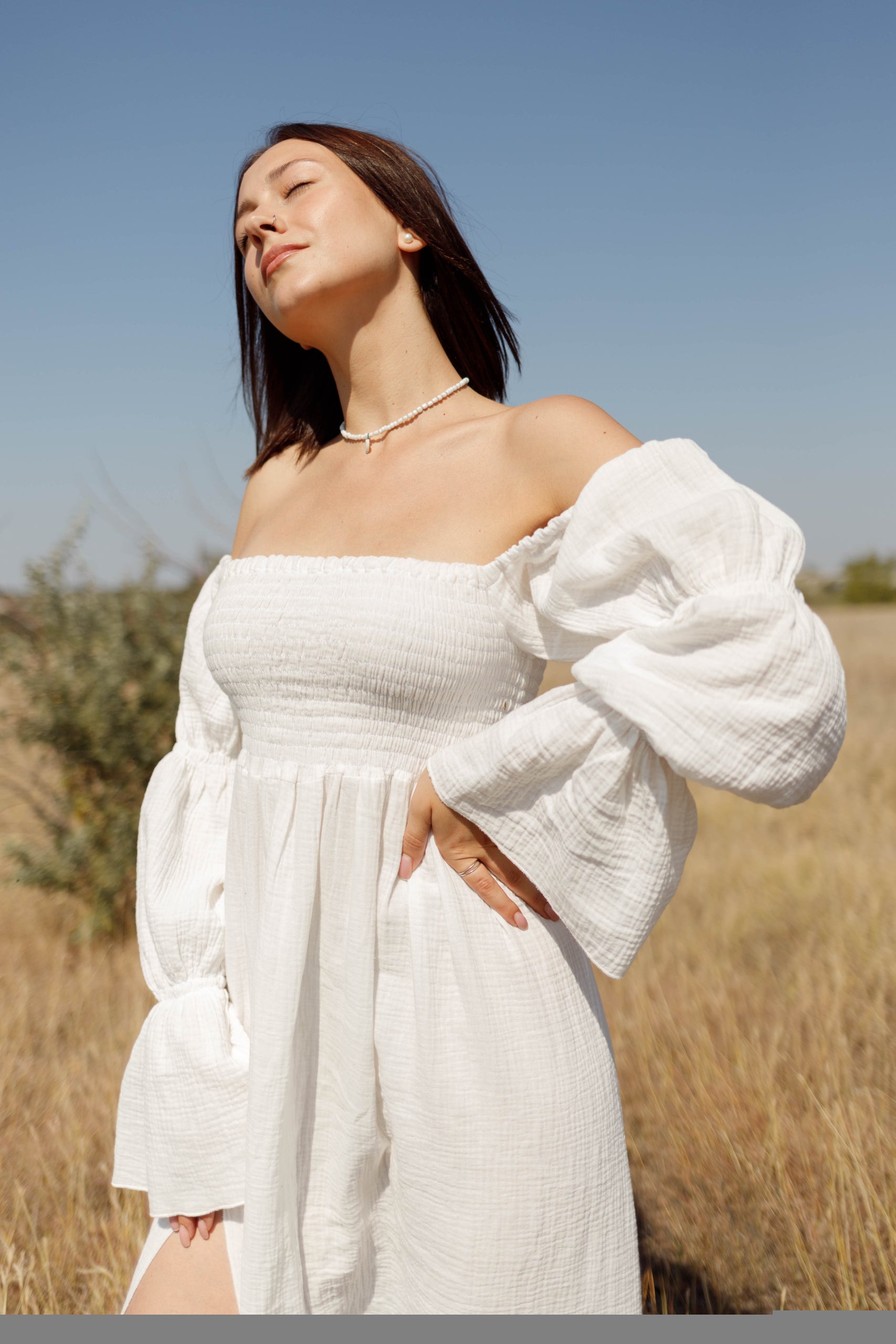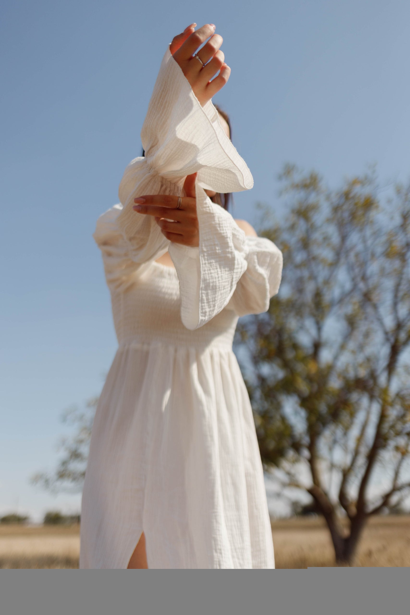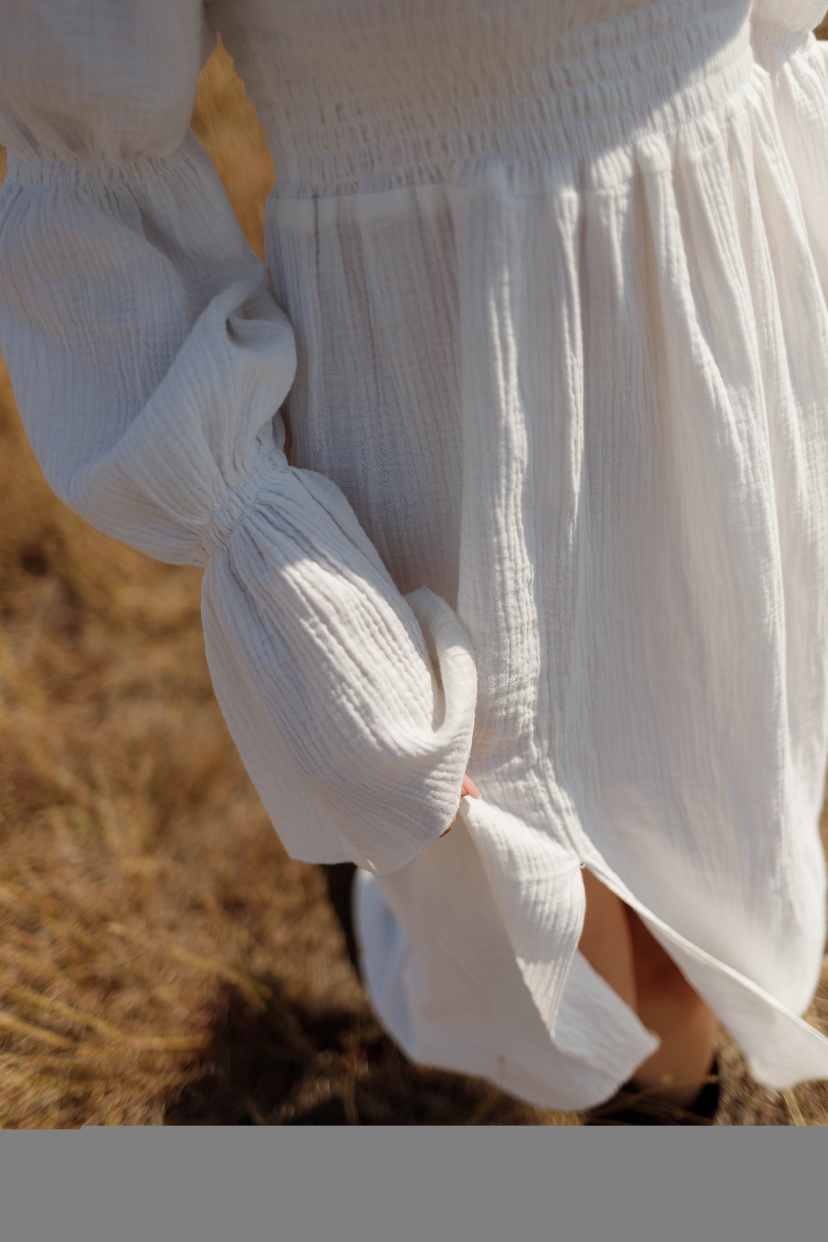 Виготовлена з мусліну (склад 100% бавовна). Не просвічується, за рахунок жатої структури тканини не потребую додаткового прасування. Ідеально підходить для спеки.