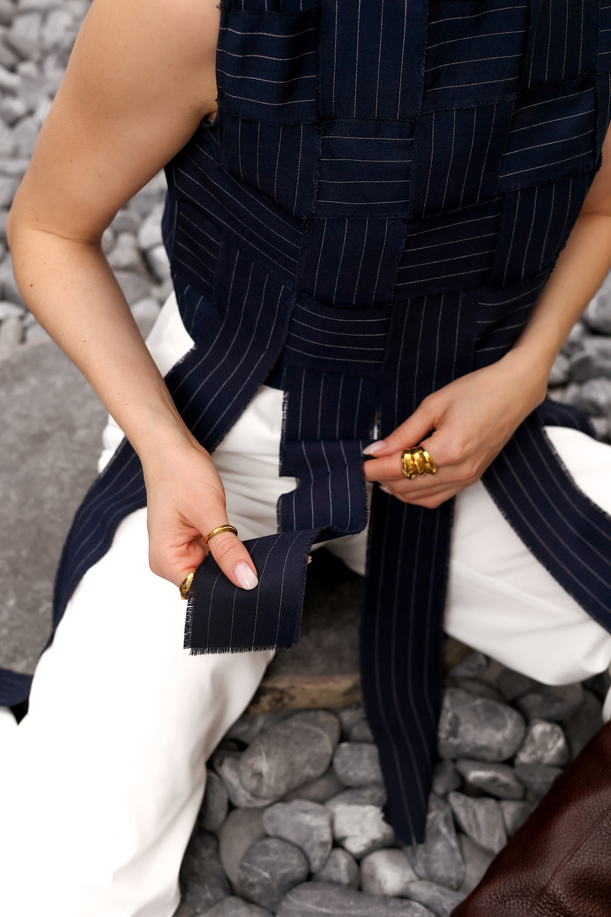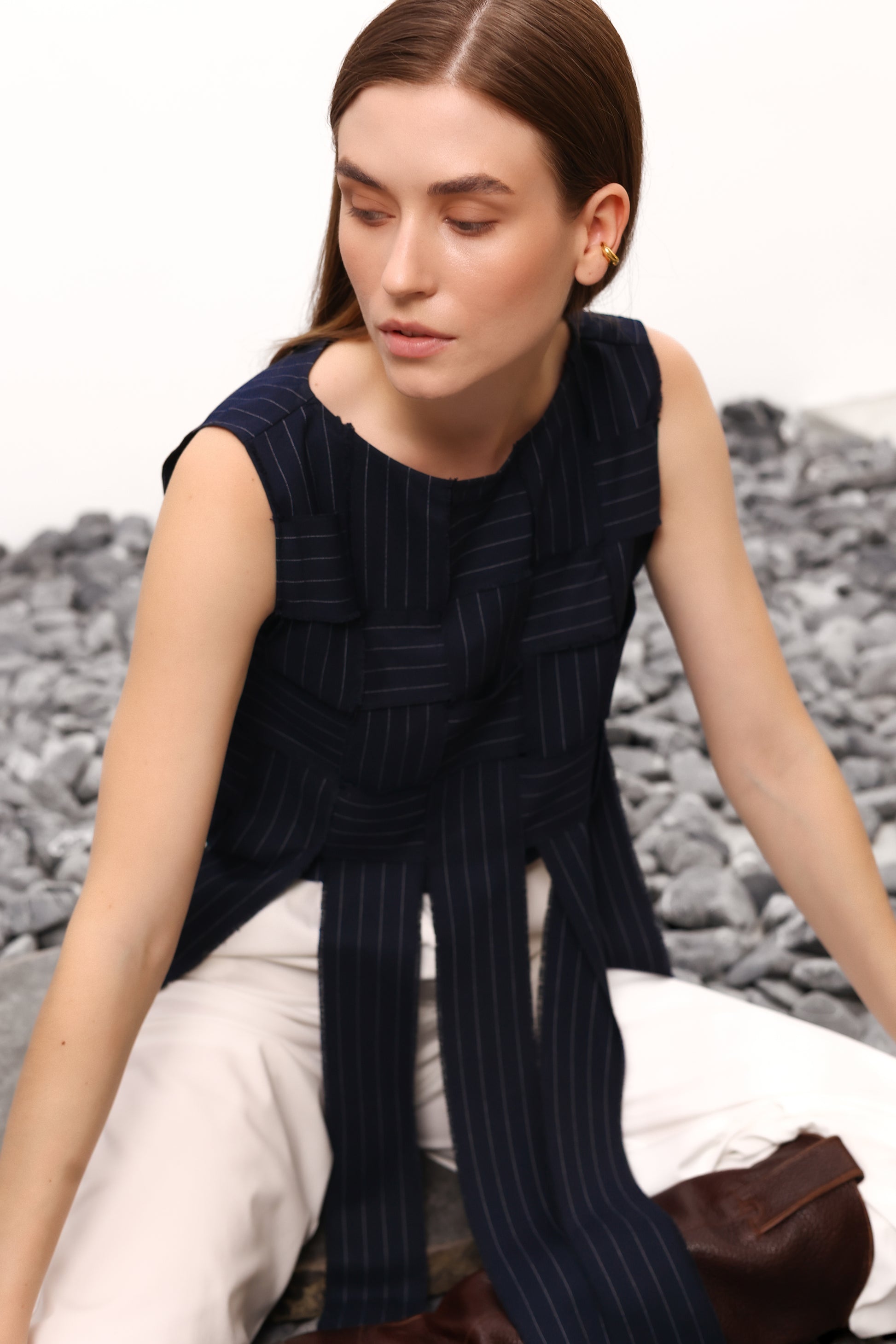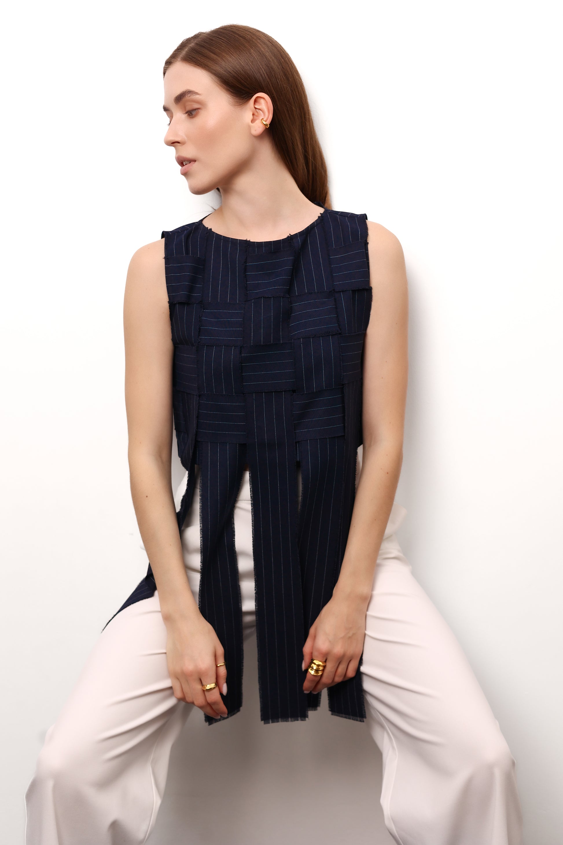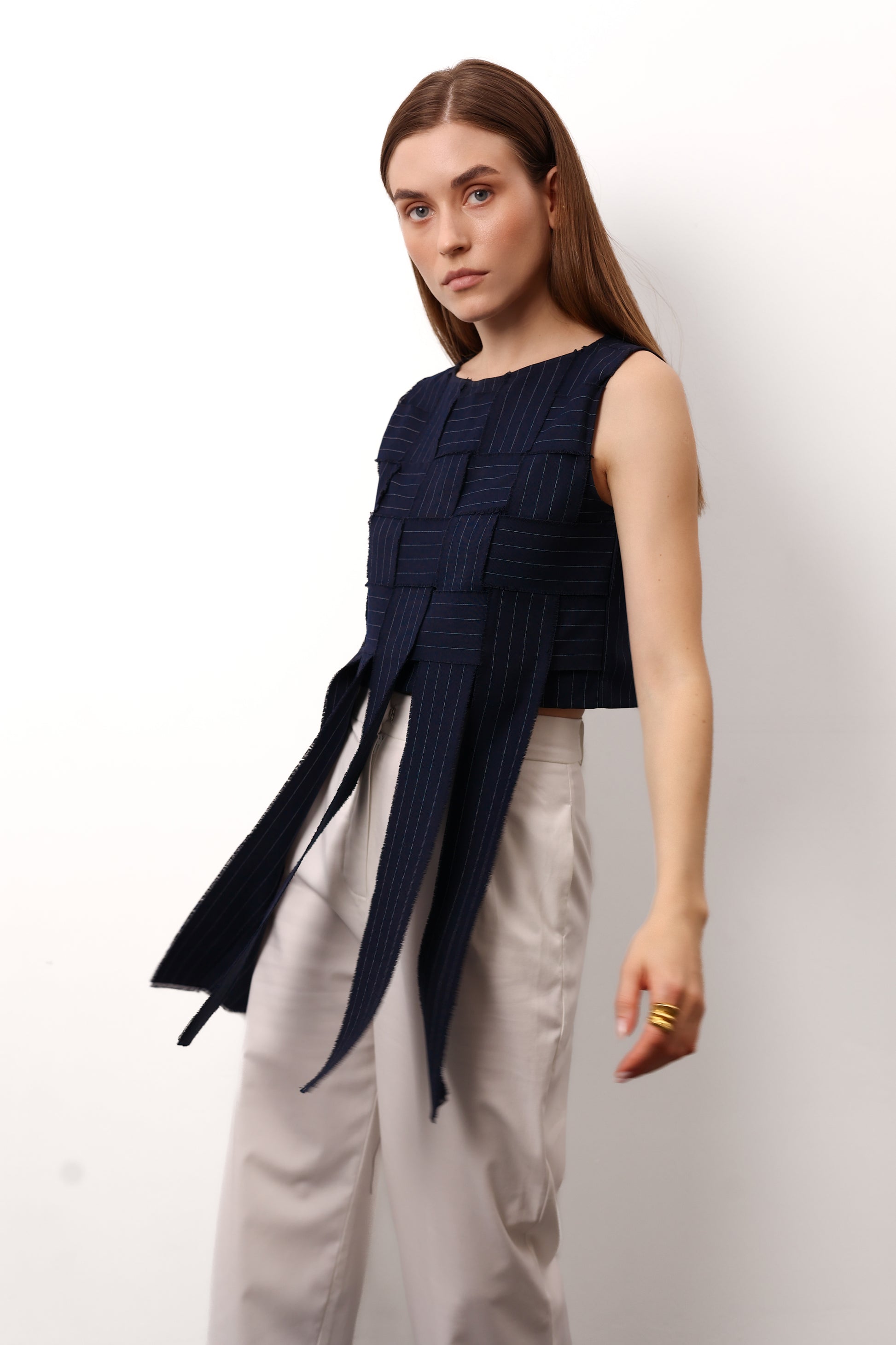 Топ прямого крою з декоративним плетінням та бахромою у кольорі navy blue. Виконаний з костюмної тканини. Плетіння попереду виконується вручну.