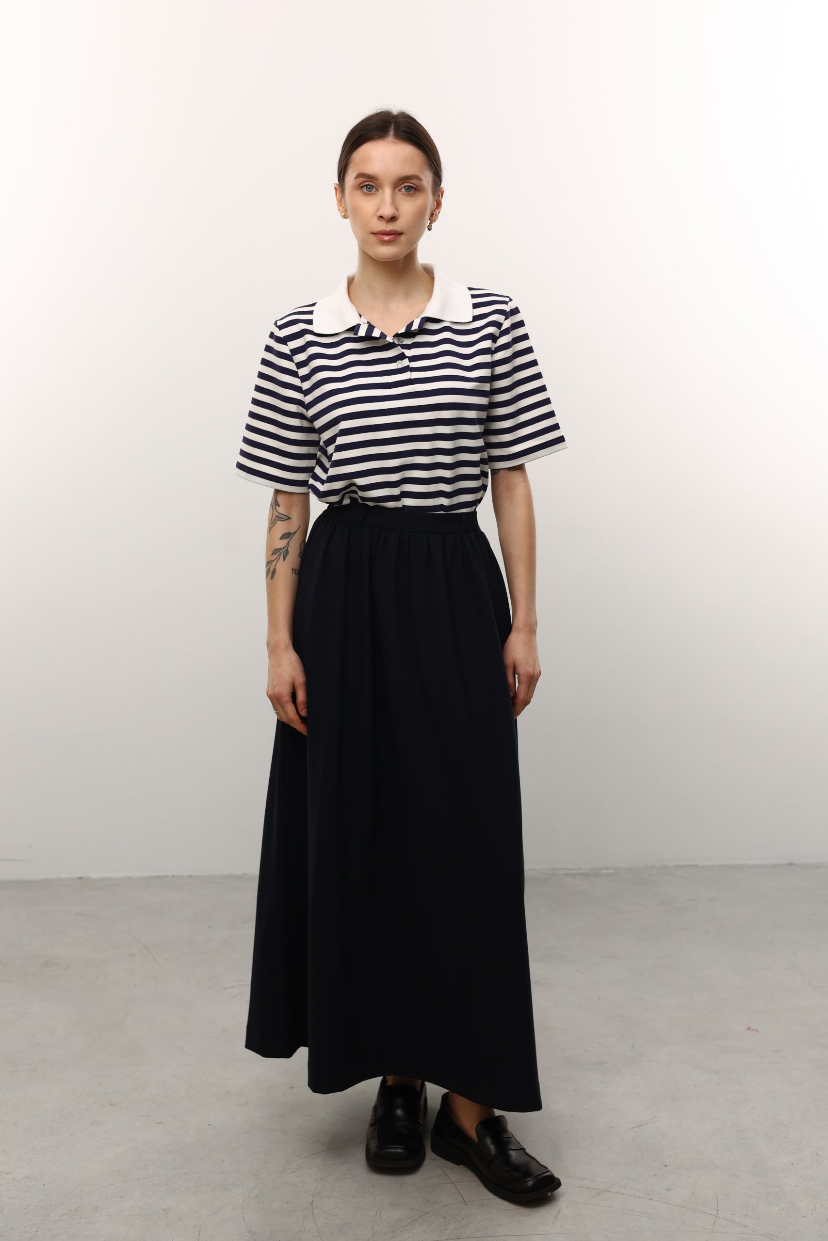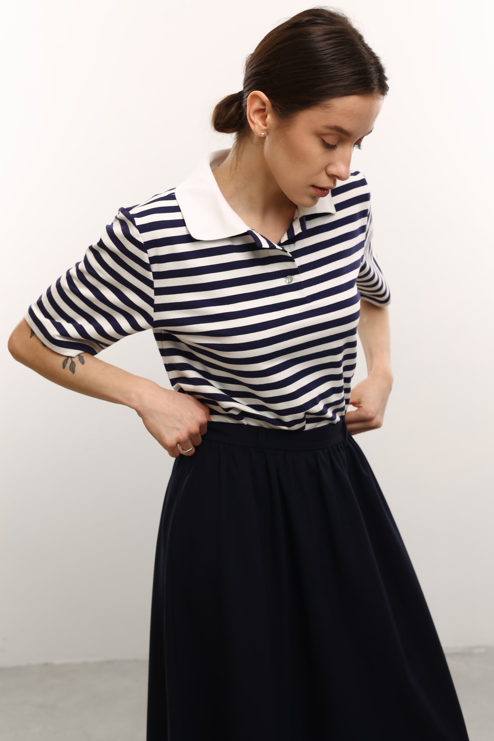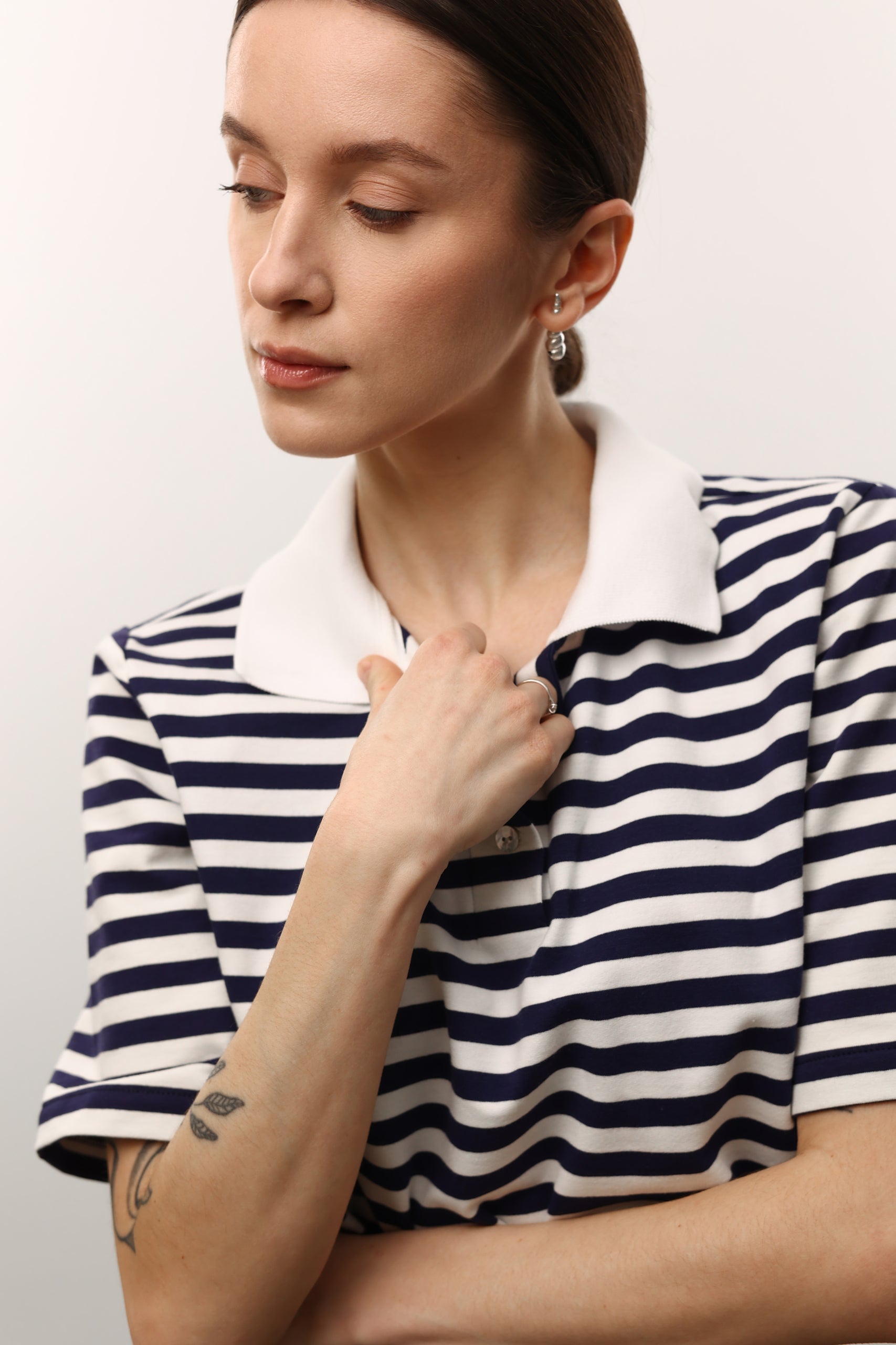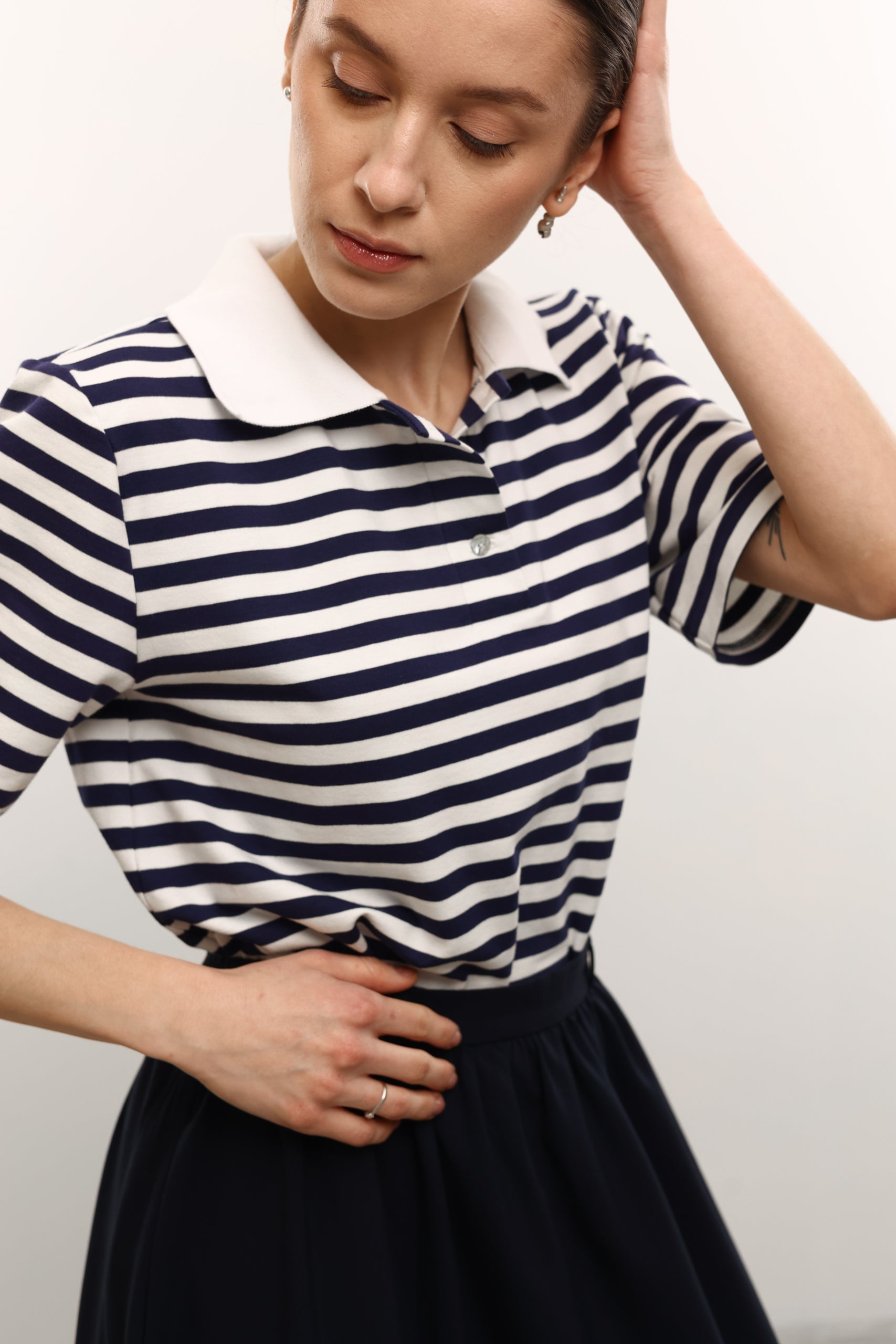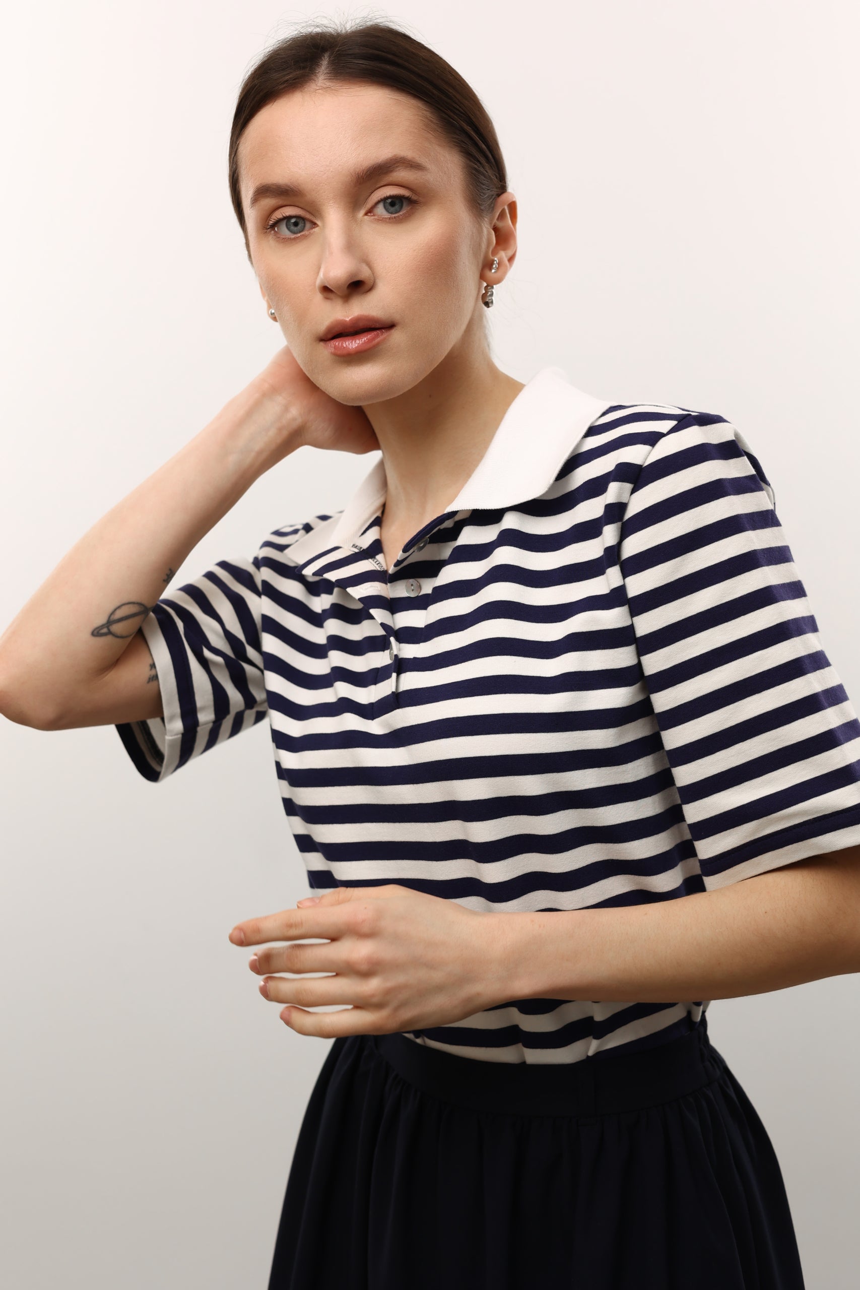 Оздоблений комірцем поло, перламутровими ґудзиками з натуральної мушлі.